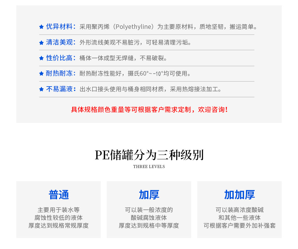 提(tí)到PE儲罐,相信大家也並不陌生了,隨著各行業的迅速發展,PE儲罐由於(yú)它(tā)的特點優勢,也在各行業中有(yǒu)了一席之地,PE儲罐又被(bèi)稱之為“聚乙烯儲罐,PE水箱,塑料水(shuǐ)塔,PE桶”等,它彌補了全塑滾塑儲罐剛性強度差,不耐壓,耐(nài)溫差的缺點。產品內襯麵平整、光滑、堅(jiān)固,具有良好的耐腐蝕、不(bú)易滲漏、不剝離、耐磨損、可耐一定壓力(lì)、可耐較高溫度、壽命更長(zhǎng)等優點,其價格低(dī)於同規格(gé)的傳統儲(chǔ)罐,是(shì)儲存腐蝕液體的較為的理想容器。